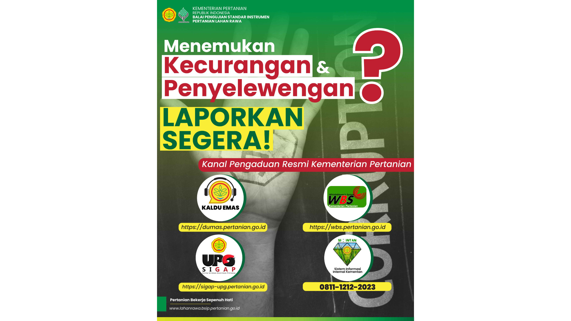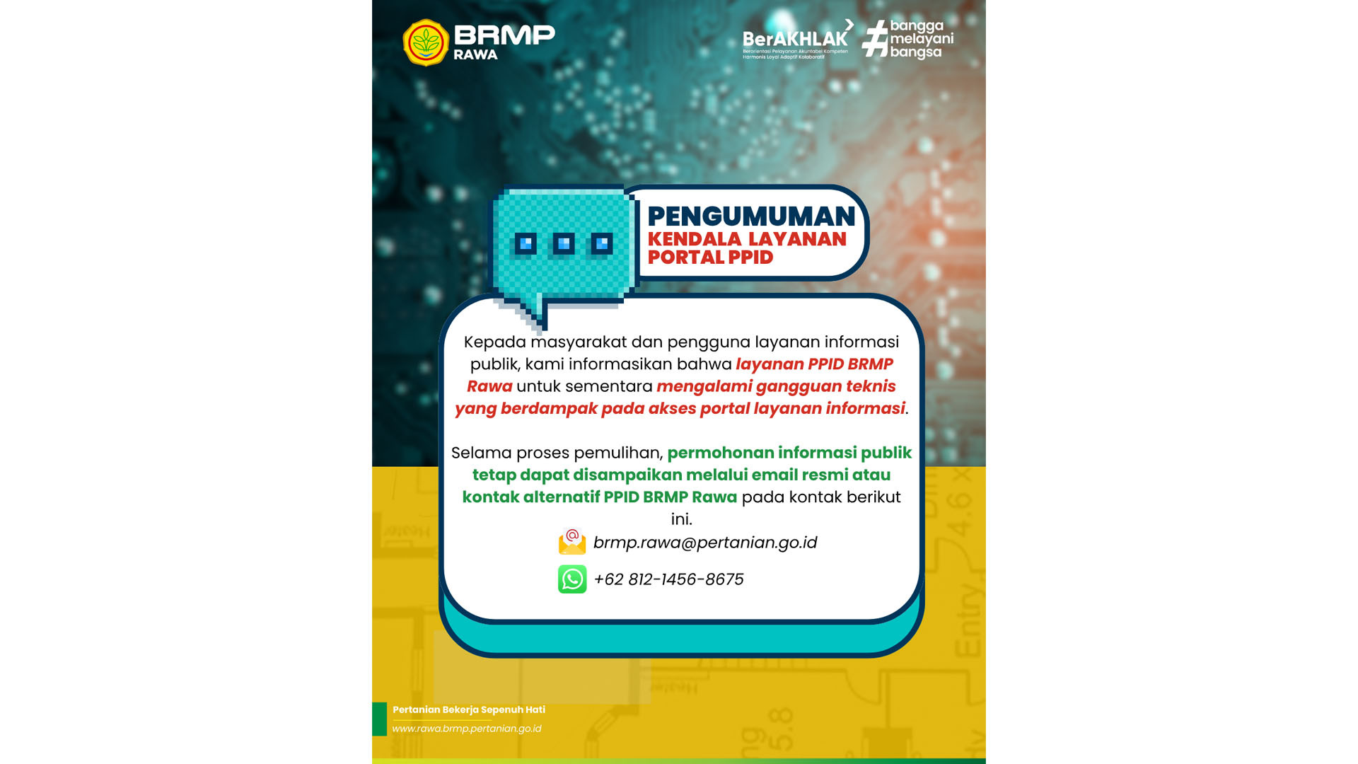 Sehubungan adanya perbaikan sistem pada Portal PPID BSIP Lahan Rawa, untuk saat ini layanan permohonan informasi dapat dilakukan melalui E-Mail dan Whatsapp.